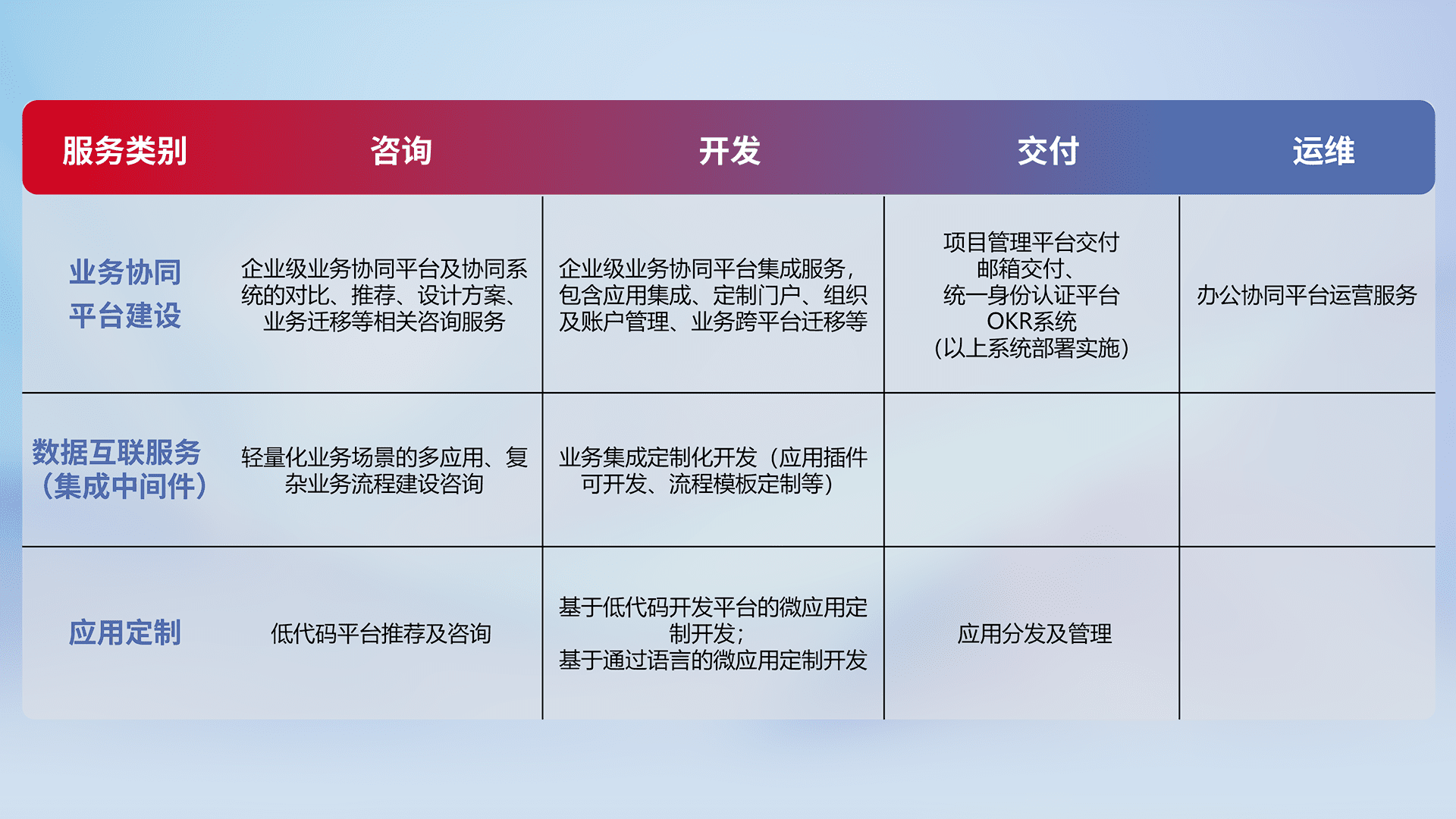 针对钉钉、、、、企微、、IDaas等平台级产品提供产品的规划、、、方案、、交付、、、定制化开发等服务,,,,实现如统一协同办公、、、、智能客户服务、、、、混合会议管理、、、智能数据查询、、、、等业务场景,,,,实现数字化转型。。。。